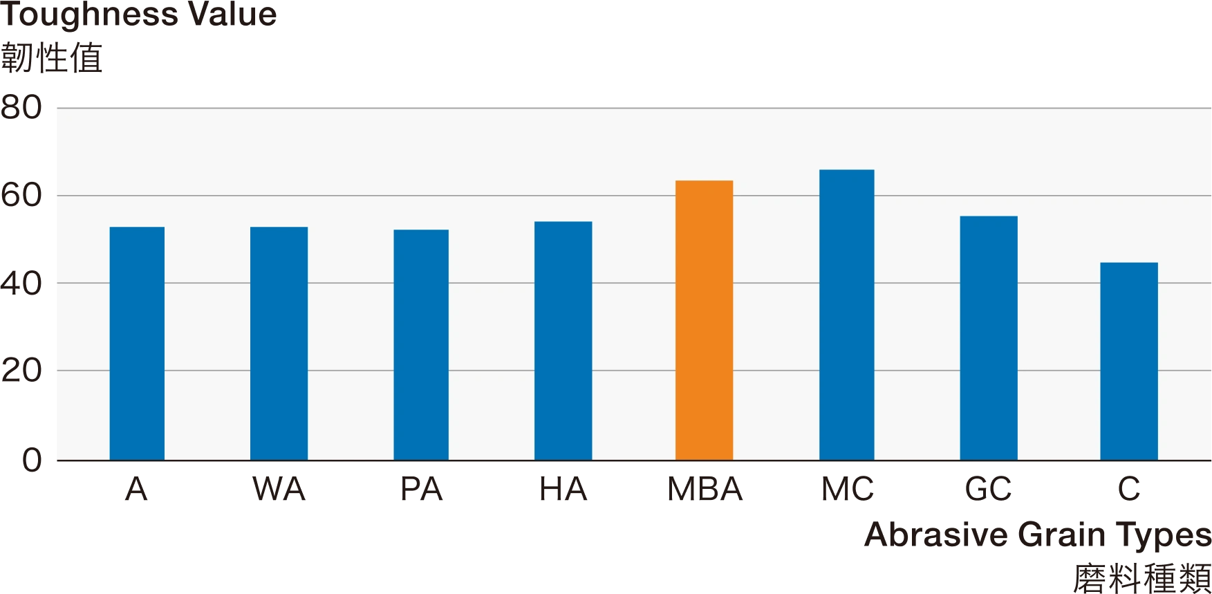 MBA磨粒顯示出僅次於陶瓷磨粒的優異韌性值。修整磨粒後, 可維持長時間的形狀保持, 確保磨粒突出量,從而達到抑制磨削燒傷,延長修整間隔。 - 與陶瓷結合劑的組合