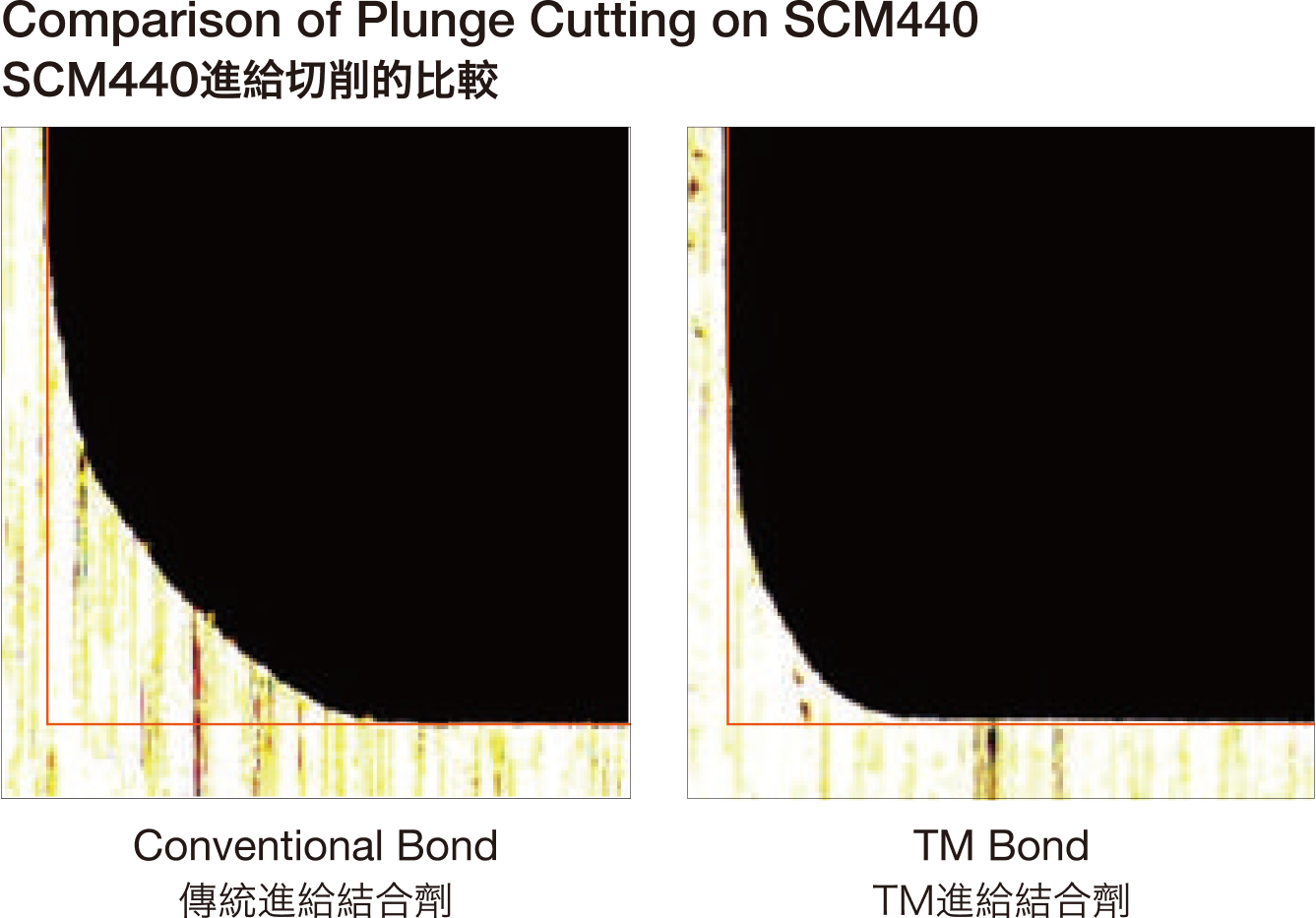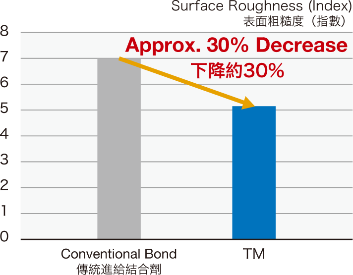 TM bond has improved strength from conventional bond, so we can make grinding wheel of same hardness grade with small amount of bond. Friction between bond and work piece is less, performance of grain is maximized. TM is applicable to fused alumina grains only. Combinations with CS series are good choice to start with.